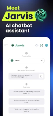 Jarvis, আপনার AI চ্যাটবট ও ব্যক্তিগত সহকারী। OpenAI-এর উপর ভিত্তি করে তৈরি, এটি কাজ, শিক্ষা ও গবেষণার জন্য একটি বহুমুখী উৎপাদনশীলতার হাতিয়ার। উন্নত প্রাকৃতিক ভাষা প্রক্রিয়াকরণের মাধ্যমে Jarvis আকর্ষণীয় কথোপকথন, টেক্সট সম্পূর্ণকরণ এবং সৃজনশীল লেখা সরবরাহ করে।