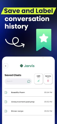 আপনার পূর্ববর্তী আলোচনাগুলি সহজে চালিয়ে যান জাভিস-এর সংরক্ষিত চ্যাট ফিচারের মাধ্যমে, যেখানে আপনি আপনার কথোপকথন যেখানে শেষ করেছিলেন সেখান থেকেই আবার শুরু করতে পারবেন। জাভিস অফিশিয়াল ডেভেলপার এপিআই ব্যবহার করে আপনার প্রতিটি প্রশ্নের সেরা উত্তর প্রদান করে, যা আপনাকে নিরবচ্ছিন্ন এবং উন্নত অভিজ্ঞতা নিশ্চিত করে। আরও বেশি ক্ষমতা এবং উন্নত বৈশিষ্ট্যের জন্য জাভিস প্রো-তে আপগ্রেড করুন এবং কৃত্রিম বুদ্ধিমত্তার অপার সম্ভাবনা সম্পূর্ণভাবে উন্মোচন করুন।